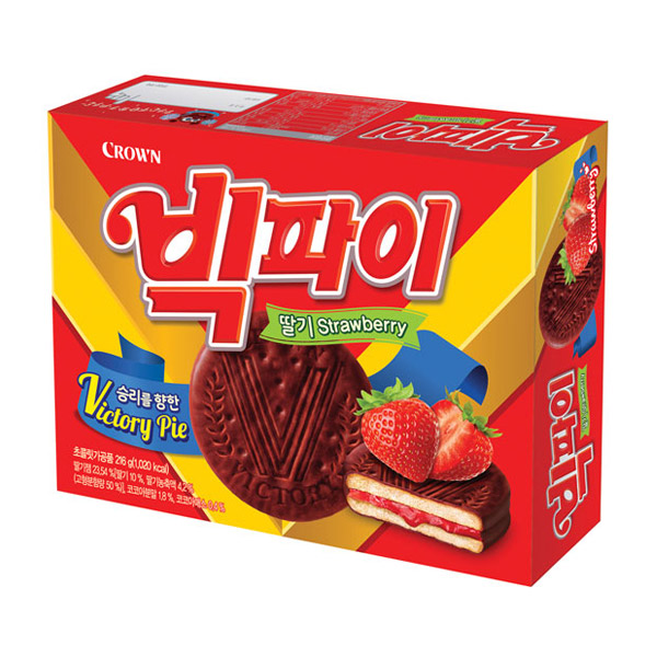 딸기 잼을 넉넉히 채운 초코파이 스타일의 과자입니다. 초콜릿 코팅과 부드러운 크림, 새콤달콤한 딸기 맛이 어우러져 있어요. 간식이나 간단한 디저트로 즐기기 좋습니다.