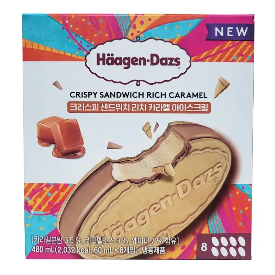 카라멜 아이스크림을 바삭한 웨이퍼로 감싼 아이스크림 샌드위치입니다. 진한 카라멜 풍미와 초콜릿 코팅, 아삭한 웨이퍼의 식감이 어우러져 있어요. 특별한 디저트를 원할 때 즐기기 좋은 아이스크림입니다.