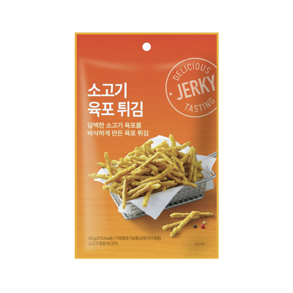 소고기 육포를 바삭하게 튀긴 스낵입니다. 씹을수록 고소한 감칠맛이 진하게 느껴지며, 바삭한 식감이 특징이에요. 술안주나 간식으로 즐기기 좋습니다.