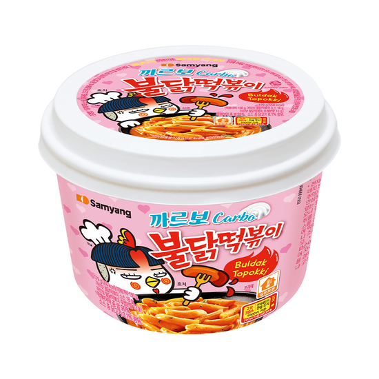 까르보 크림소스와 불닭의 매콤한 맛이 어우러진 컵떡볶이입니다. 국내산 쌀로 만든 쫄깃한 떡이 특징이며, 간식이나 야식으로 먹기 좋습니다. 매운맛을 좋아하는 분들의 입맛에 딱 맞는 제품이에요.