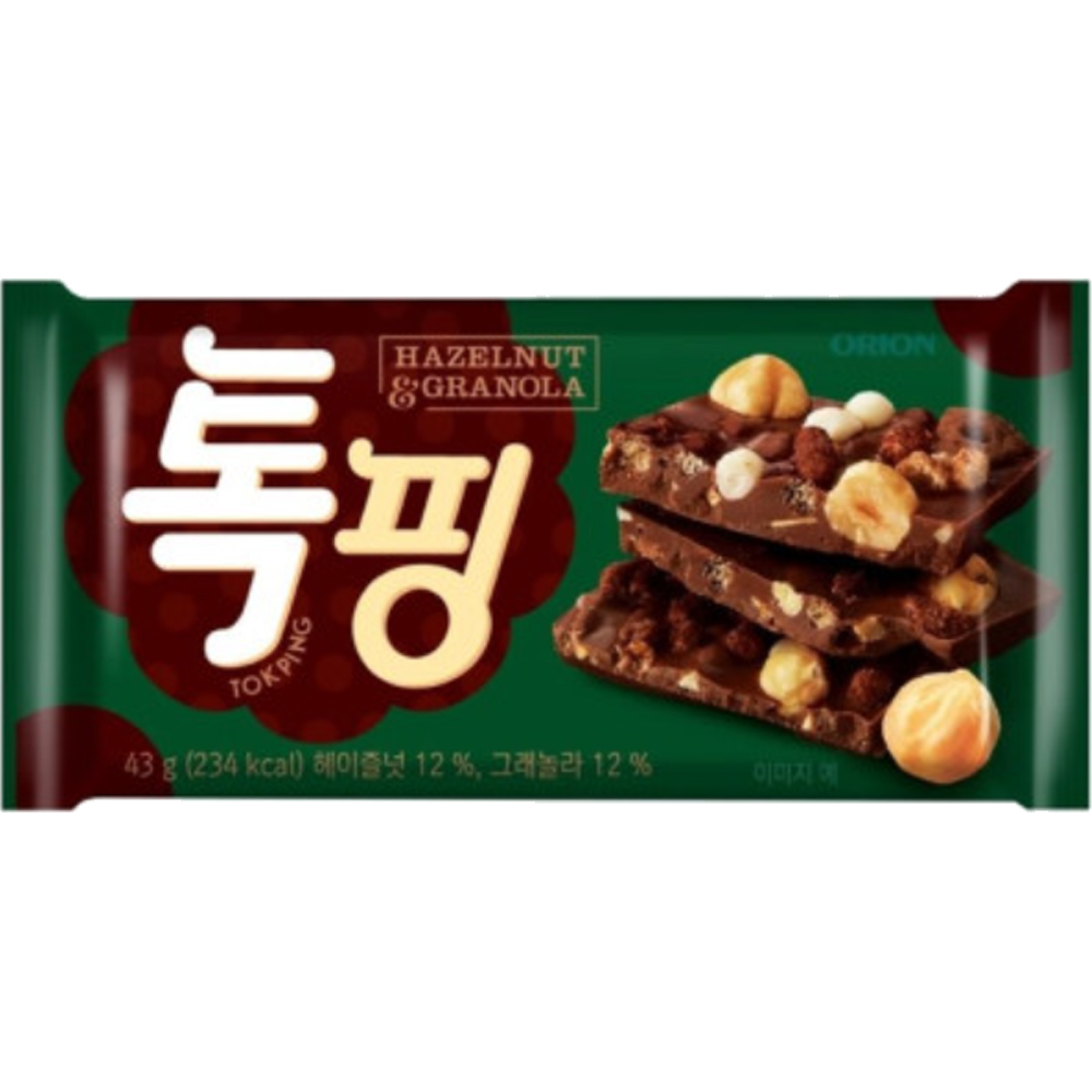 오리온 톡핑 헤이즐넛 그래놀라는 초콜릿 위에 고소한 헤이즐넛과 바삭한 그래놀라를 올린 과자입니다. 견과류의 풍부한 향미와 곡물의 식감이 조화로우며, 든든한 간식을 찾는 분에게 추천합니다.