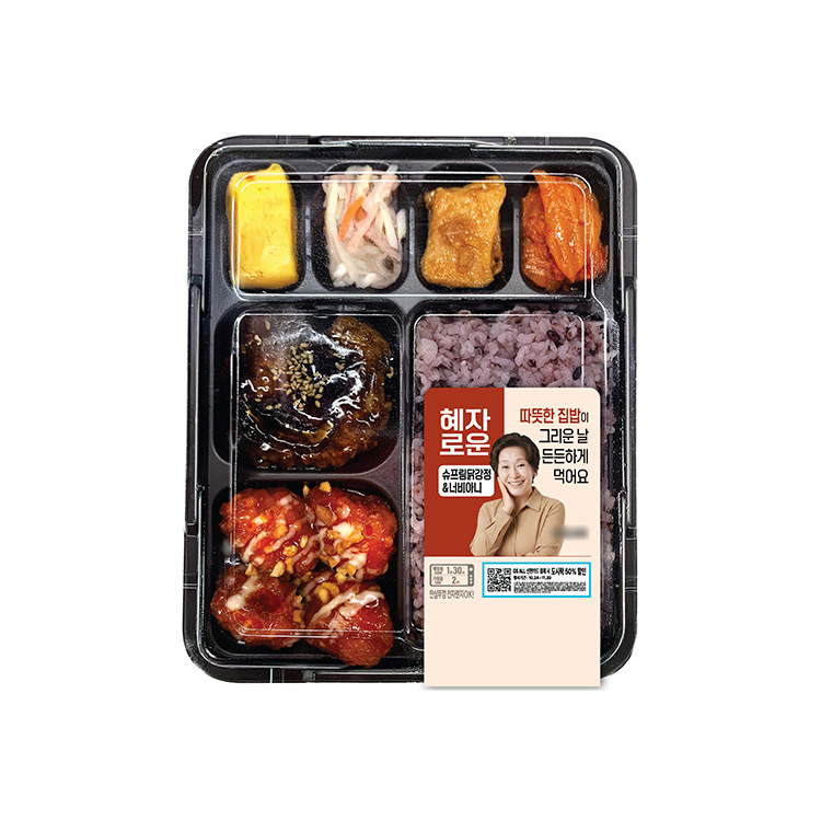 검은 쌀에 닭강정과 너비아니, 계란말이 등 7가지 반찬이 담긴 풍성한 도시락입니다. 닭강정의 매콤한 맛과 너비아니의 부드러운 소고기 맛이 어우러져 다양한 입맛을 만족시킵니다. 든든한 한 끼 식사가 필요할 때 추천합니다.