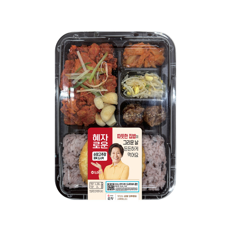 순창 고추장으로 양념한 제육볶음이 주인공인 도시락입니다. 고추장의 깊은 맛이 돋보이면서도 자극적이지 않게 표현되어 밥과 잘 어울립니다. 풍미 있는 제육을 좋아하는 분들께 추천합니다.